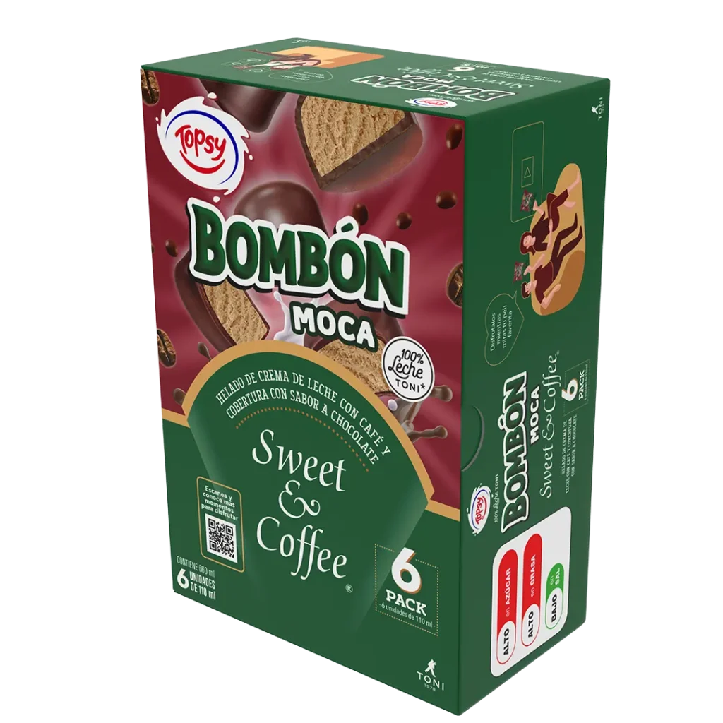 Todo lo que te gusta de Topsy en formato snack para esos antojos ¡on the go! Cremoso helado elaborado con 100% leche toni en forma de bombones y con el delicioso sabor del café Sweet and Coffee.