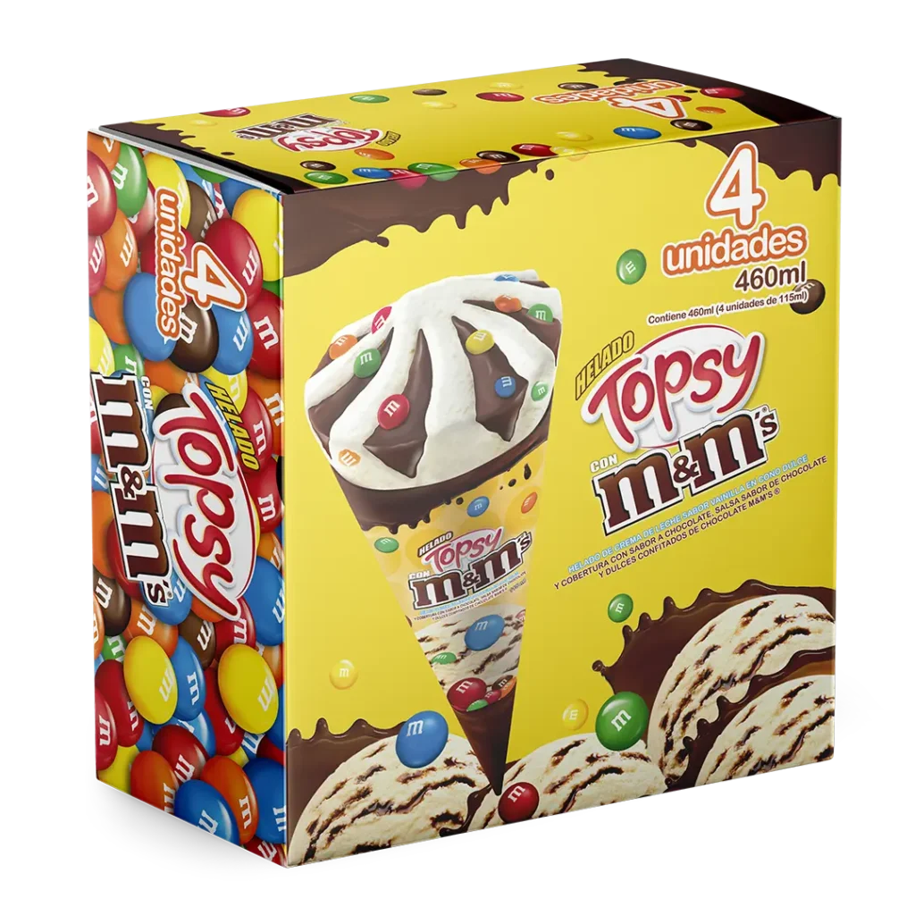 Disfruta la cremosidad del helado Topsy de vainilla con los deliciosos chocolates M&M y jalea de chocolate.