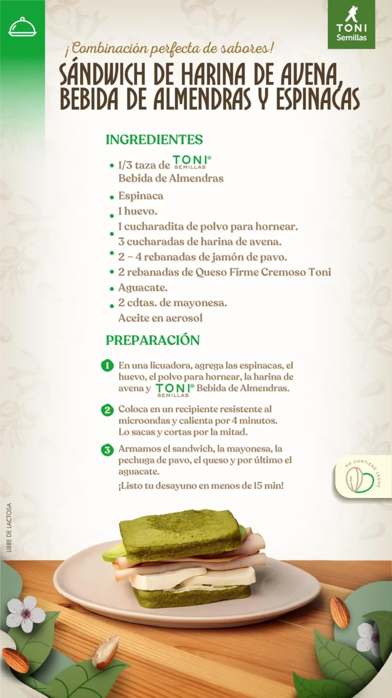 Sándwich de harina de avena, bebida de almendras y espinacas. Preparación sencilla con Toni Semillas o Manjar Toni según receta.