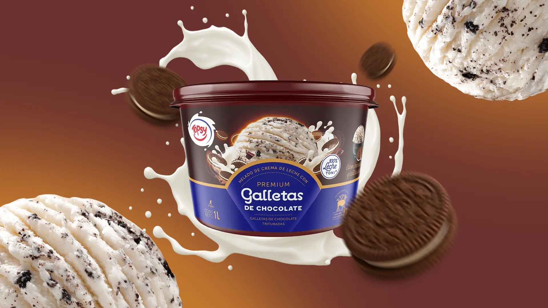 ¡Que bien sabe compartir! Disfruta nuestros litros de helado Topsy con los que más quieres. Cremoso helado con 100% leche Toni y sabor vainilla con trozos de galleta de chocolate