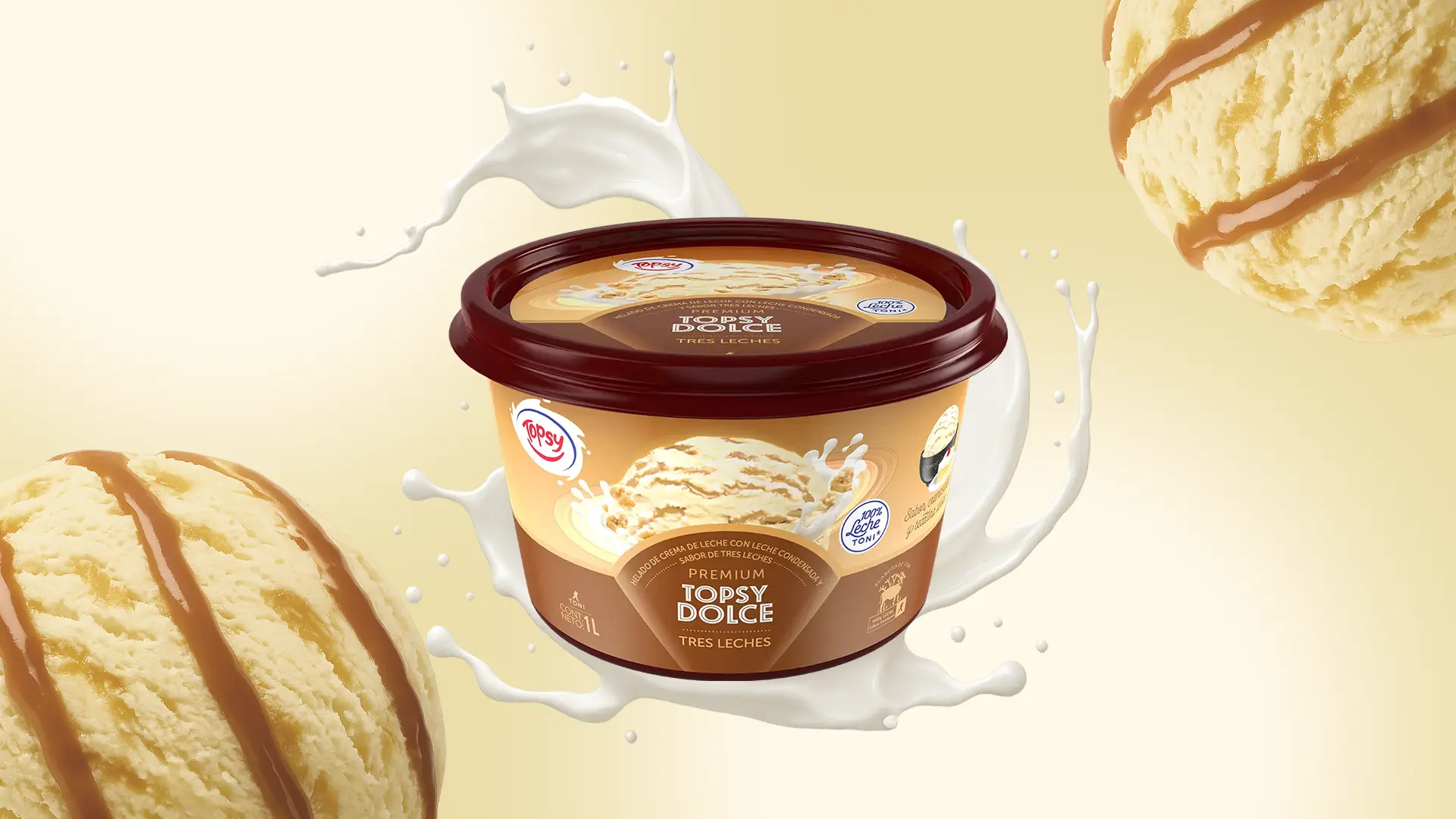 ¡Que bien sabe compartir! Disfruta nuestros litros de helado Topsy con los que más quieres. Cremoso helado con 100% leche Toni y sabor tres leches y leche condensada