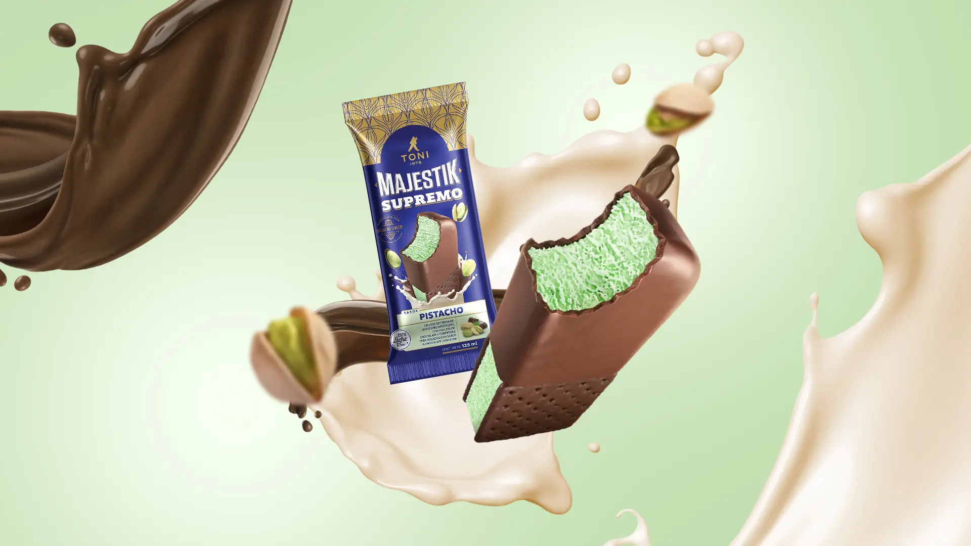 Disfruta una doble experiencia única con Toni Majestik Supremo. Helado sabor pistacho con una exquisita capa de cacao fino de aroma ecuatoriano y dos galletas de chocolate. Simplemente irresistible.
