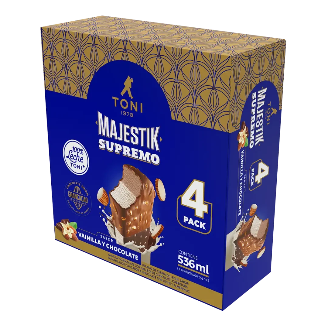 Disfruta una doble experiencia única con Toni Majestik Supremo. Helado sabor vainilla y chocolate con una exquisita capa de cacao fino de aroma ecuatoriano con trozos de almendras y dos galletas de chocolate. Simplemente irresistible.