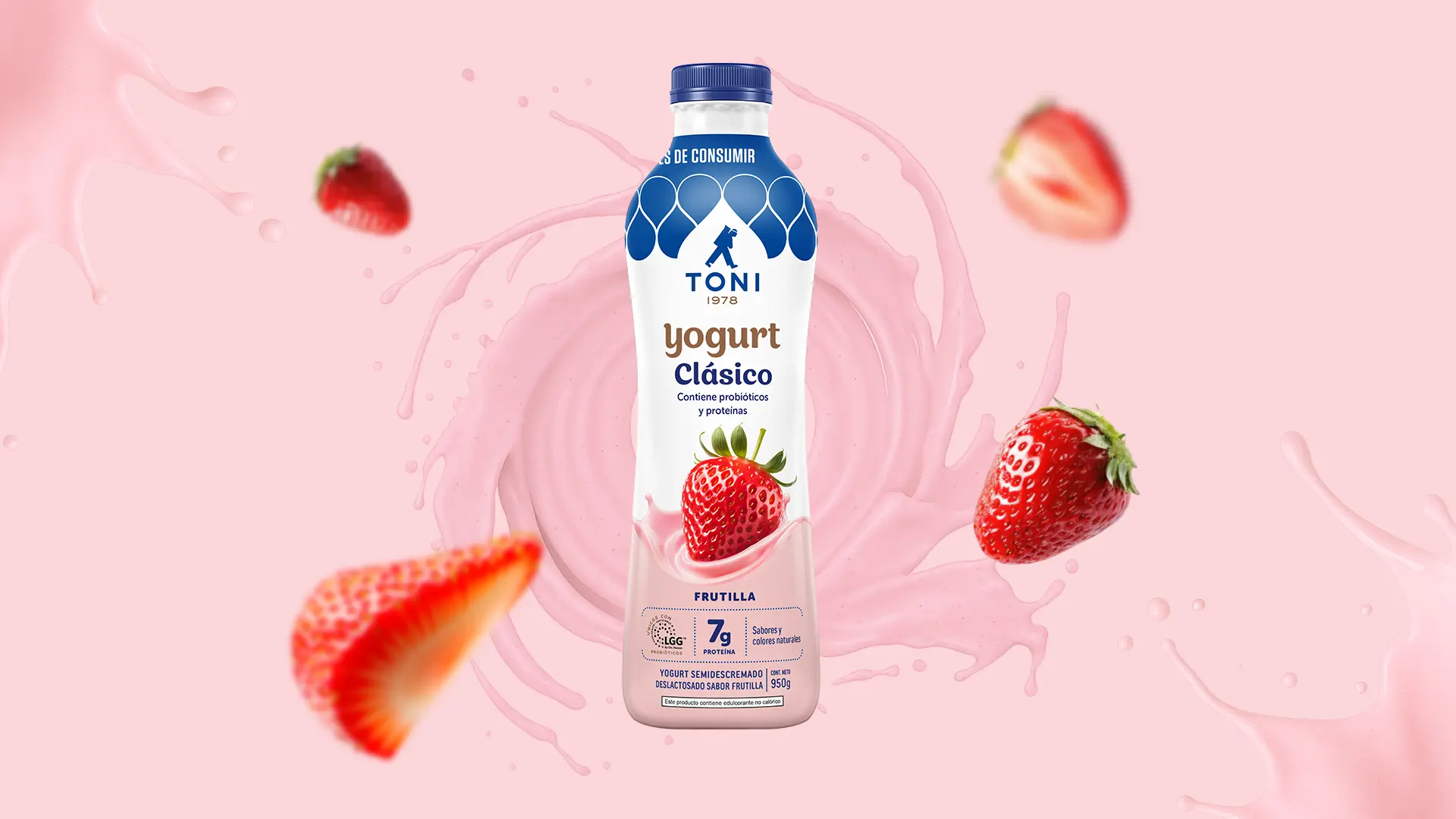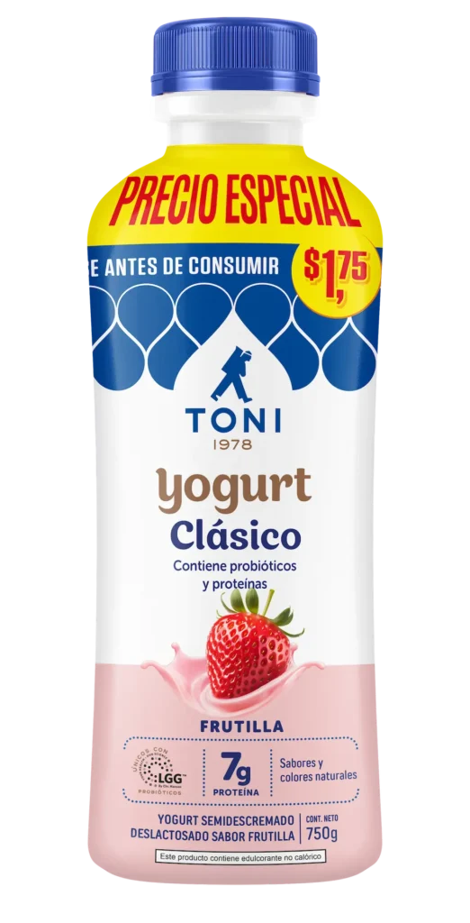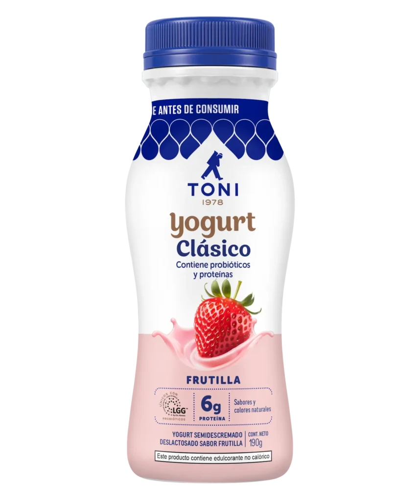 Yogurt Toni Clásico es un alimento funcional por su contenido nutricional y sus beneficios: contiene proteínas, únicos en probiótico LGG, es reducido en azúcar, no tiene espesantes y esta elaborado con sabores y colores naturales. Prefereido por sus delciosos sabores y consistencia, es una opción ideal para el desayuno y los momentos de snacking dentro y fuera del hogar. Sus sabores son: Frutilla, Durazno, Vainilla y Mora.
