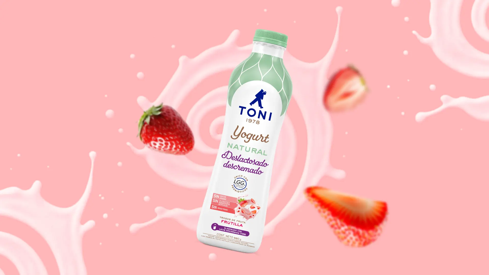 Yogurt Toni Natural cescremado deslactosado, es un yogurt listo para las personas intolerantes a la lactosa, contiene una reducción del 99.9% en lactosa. Además es un producto liviano al ser descremado, te brinda una experiencia de sabor y textura única con sus trozos de frutilla. No tiene azúcar añadida.