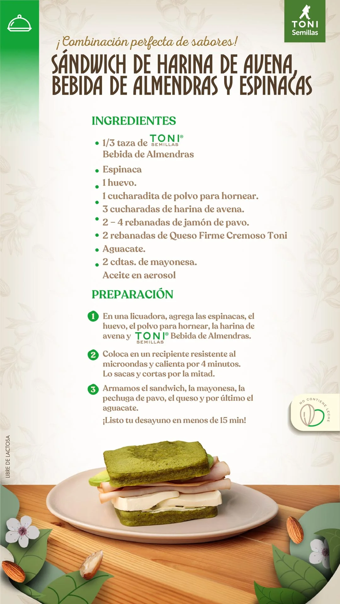 Sándwich de harina de avena, bebida de almendras y espinacas elaborada con productos ecuatorianos Toni para lograr sabor y practicidad. Usamos Toni Semillas Bebida de Almendra, de origen vegetal y fortificada con calcio y vitaminas A y D, ideal para recetas dulces y saladas. Receta pensada para el día a día: pocos pasos, ingredientes accesibles y resultados deliciosos.